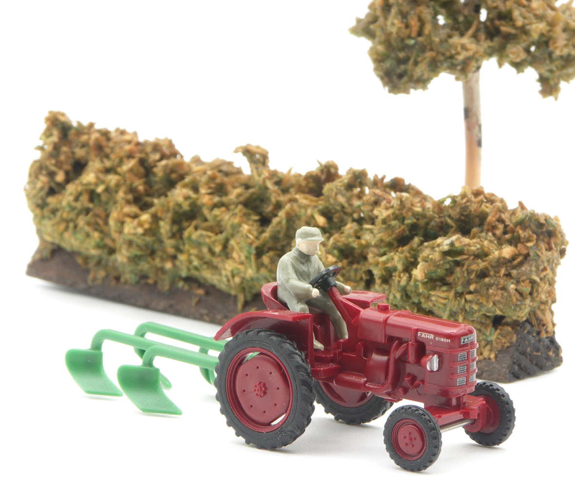 Restbestände der MB-trac Anbaugeräte, die für hauseigene Sondermodell-Editionen bei WIKING in drei Farben gefertigt wurden, finden in einer großen, papyrusweißen Geschenkbox zusammen. Pflug, Saatmaschine/Drillmaschine und 3-teilige Egge sind in purpurrot, pastellblau und quarzgrau in der Packung optisch ansprechend eingelegt. Seinerzeit wurde das einfarbige Set für den MB-trac unter der Programmnummer 1385 geführt, zeitweise in einer N-Spur Verpackung angeboten. Das auf 100 Stück limitierte Set kostet 35,70 Euro. → Link zum Angebot