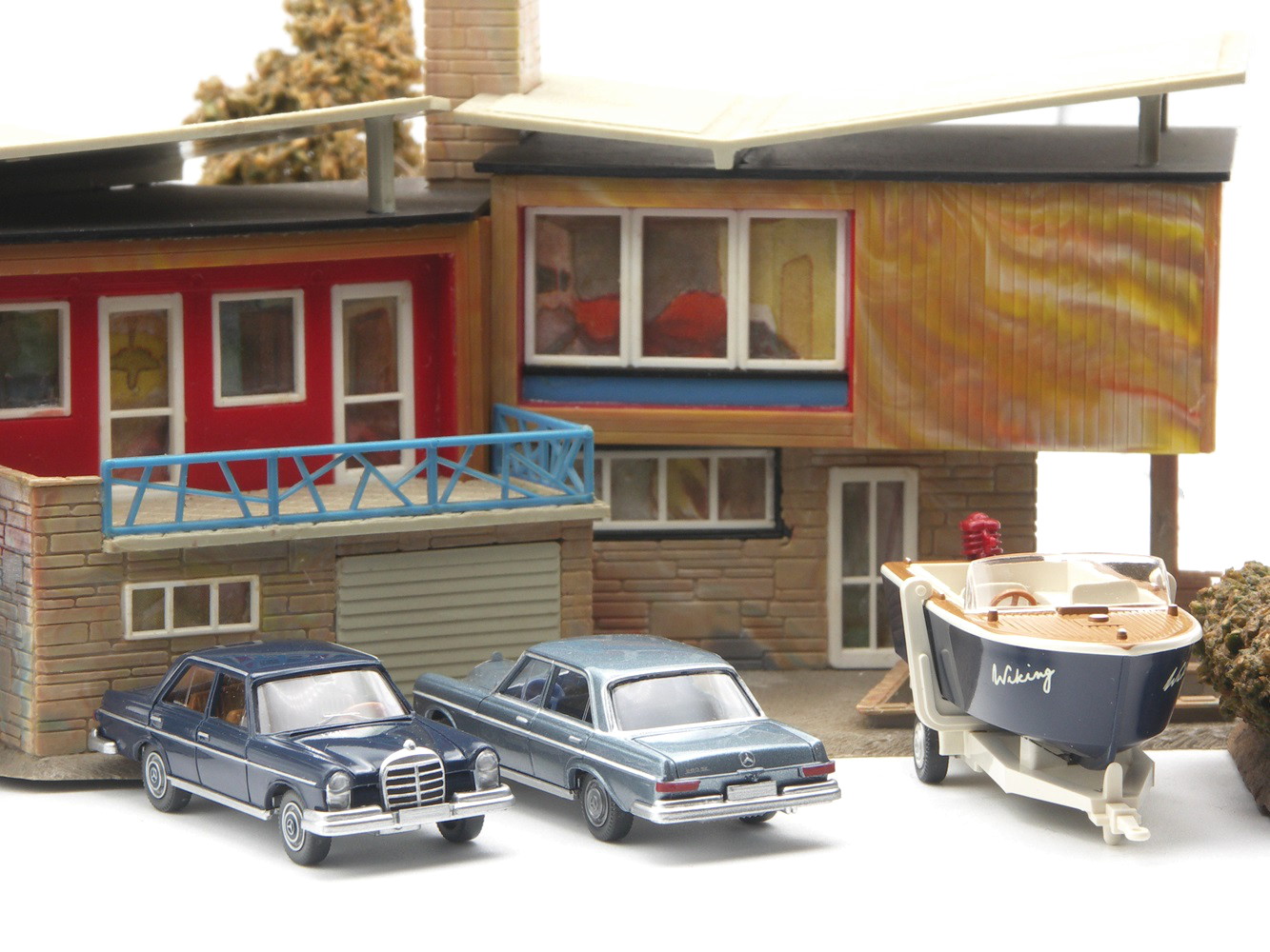 Landhaus und Garage werden als Fertigmodelle ausgeliefert. Das Dach des Landhauses ist abnehmbar, so dass es mit Möbeln bestückt werden kann. Das Garagentor ist wie gewohnt beweglich und klappbar.