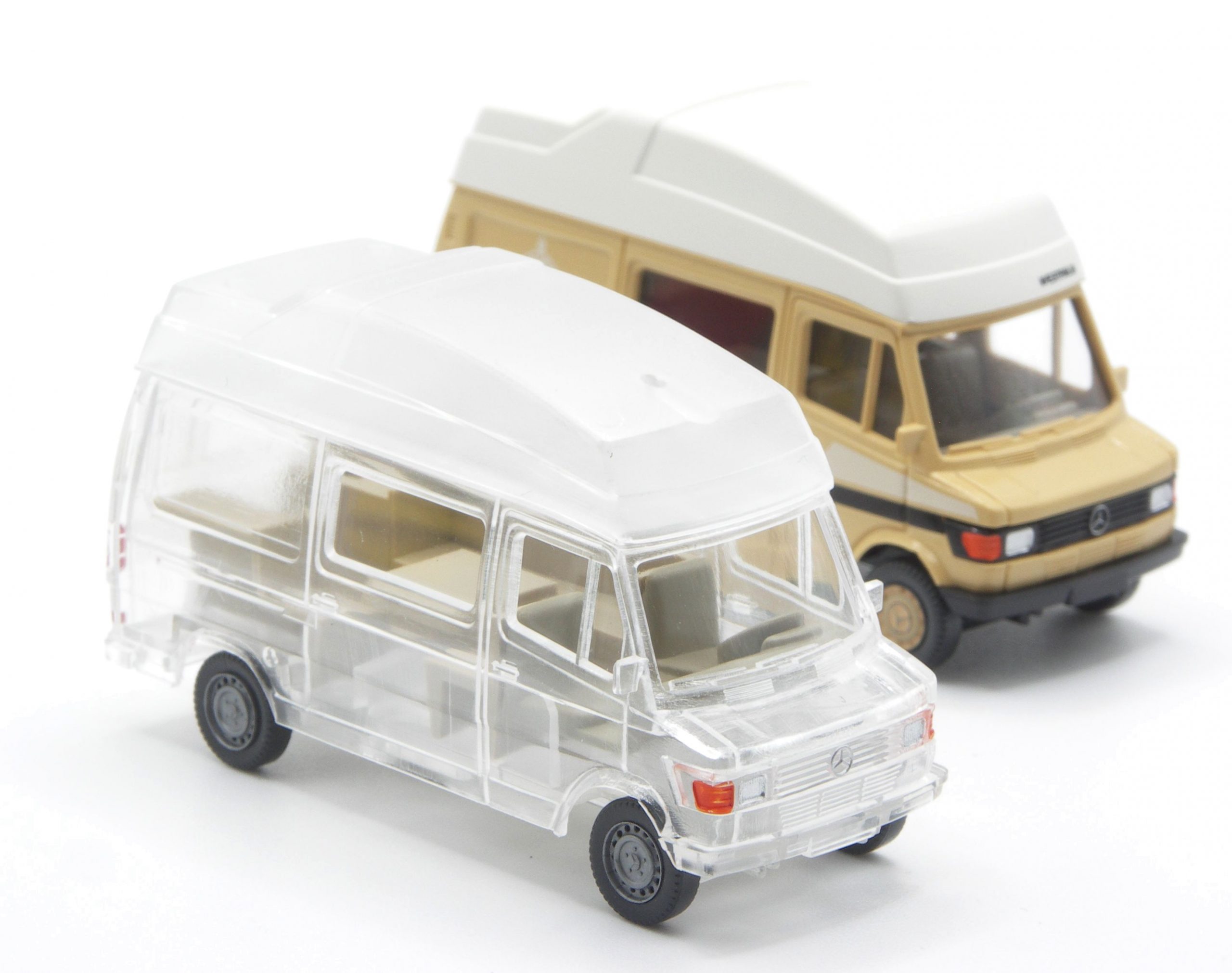 Ein Wiedersehen gibt es mit dem Opel Senator A von 1979. Das Modell erschien bei WIKING erstmals 1980, und war bis 1988 in fünf Farben im Programm. Ein Teil der Bauteilformen fehlte bislang, konnte aber jetzt wohl im riesigen Formenarchiv gfunden, und dem Senator zugeordnet werden. Damit wächst – neben Hoffnungen auf Taxi oder Einsatzfahrzeuge – auch die auf die Wiederauflage des legendären Opel Monza. Transparent erinnert das James Cook Wohnmobil an die Sondermodelle aus der Siku//WIKING Modellwelt und zeigt sich offen für den Betrachter.