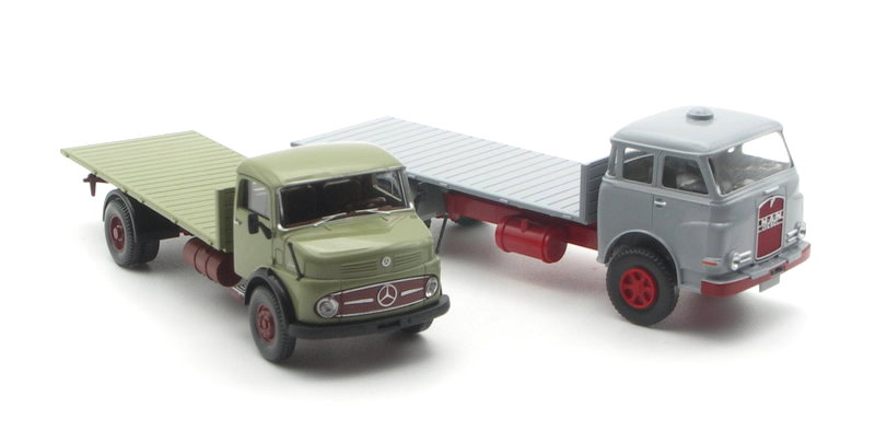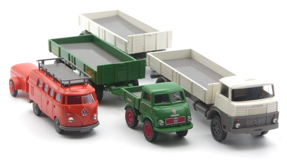 Bei einem Anhänger-Set ist klar, dass die enthaltenen Modelle auf ein passendes Zugfahrzeug angewiesen sind. Die drei Anhänger zielen dabei auf ganz besondere Modelle ab. Denn bei der Bauteilkombination und der Farbabstimmung hat Michi Bloßl drei Zugfahrzeuge besonders im Auge gehabt. Farblich passend für den Henschel HS 14/16 (N) aus dem Serienprogramm (0417.03) kommt der angekündigte Anhänger mit der gleichen Pritsche ins Set. Das „Baustellen-Taxi“ (→ Modell 22) aus der hauseigenen Sondermodellreihe komplettiert der kleine rotorange PKW-Anhänger mit Deckel zum Gespann.