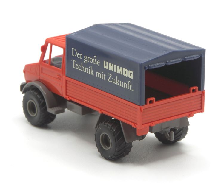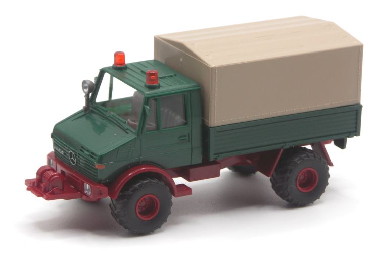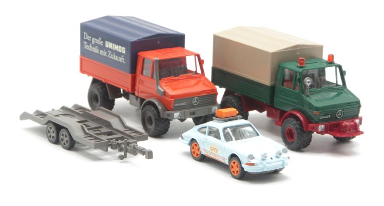 Dritter im Bunde ist ein Unimog. Der Unimog U 406 bekommt zwei Zusatzscheinwerfer auf die Fronthaube vor die Scheibe gesetzt. Der gelbolivgrüne Unimog hat ein schwarzes Fahrgestell und gelbolivgrüne Felgen mit Stollenreifen. Die Scheinwerfer sind gesilbert, die Rückleuchten sind rot bemalt. Die Türgriffe und der Stern mit Zierleiste sind schwarz abgesetzt. Der Verkaufspreis beträgt 14,99 Euro.