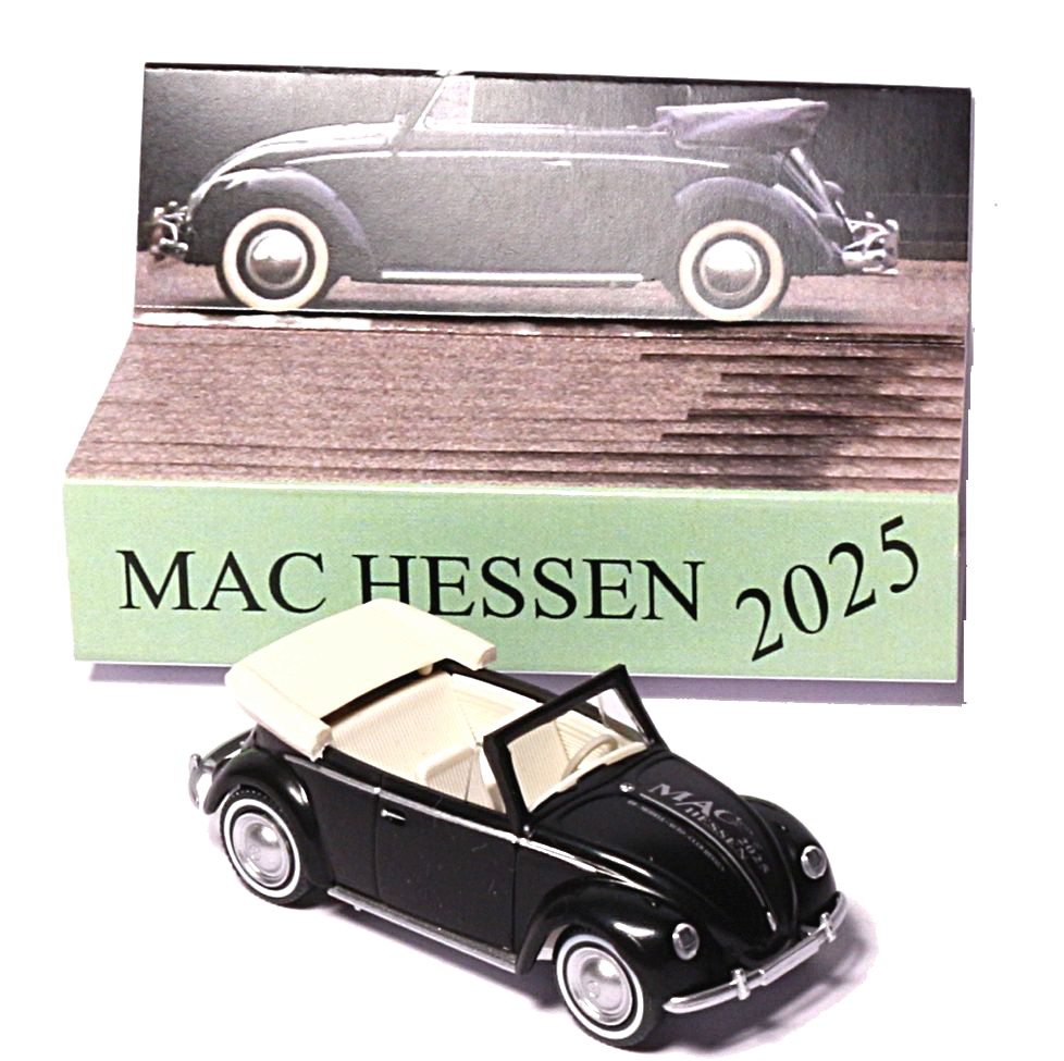 Ein schwarzer VW 1200 Käfer als Cabriolet ist das Modell der Wahl für das Jahr 2025, welches zum Pseudo-Werbemodell verändert wurde. Das Geschenk basiert auf dem Serienmodell (0794.06), welches seit August 2023 im Serienprogramm ist. Der offene Käfer erhielt auf der Motorhaube den silbernem Eigendruck „MAC HESSEN (Emblem) / 2025 / H0 – MODELL – AUTO – CLUB HESSEN“. Die Klarsichtschachtel ist mit einem gestalteten Papiereinleger „MAC HESSEN 2025“ bestückt, der auch ein passendes Vorbildfahrzeug zeigt.