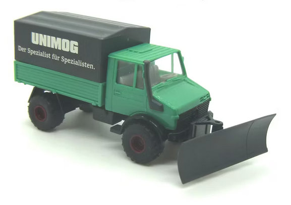 Der moosgrüne Unimog U 411 mit Doppelbereifung aus der Serie (→ 0368.03) bekommt eine eigens für den Händler produzierte ca. beigebraune Plane. Der Flachpritschenanhänger entsteht aus einem Umbau. Die Teile kommen u. a. von Modell 13, andere Radsätze mit verkehrsroten Felgen, ein schwarzes Chasis und offene Gitteraufbauten in moosgrüner Farbgebung. Das Umbaumodell kostet 35,70 Euro und ist 100-fach in einer Klarsichtschachtel mit modifiziertem Einleger verpackt. Update: 21.01. – ausverkauft
