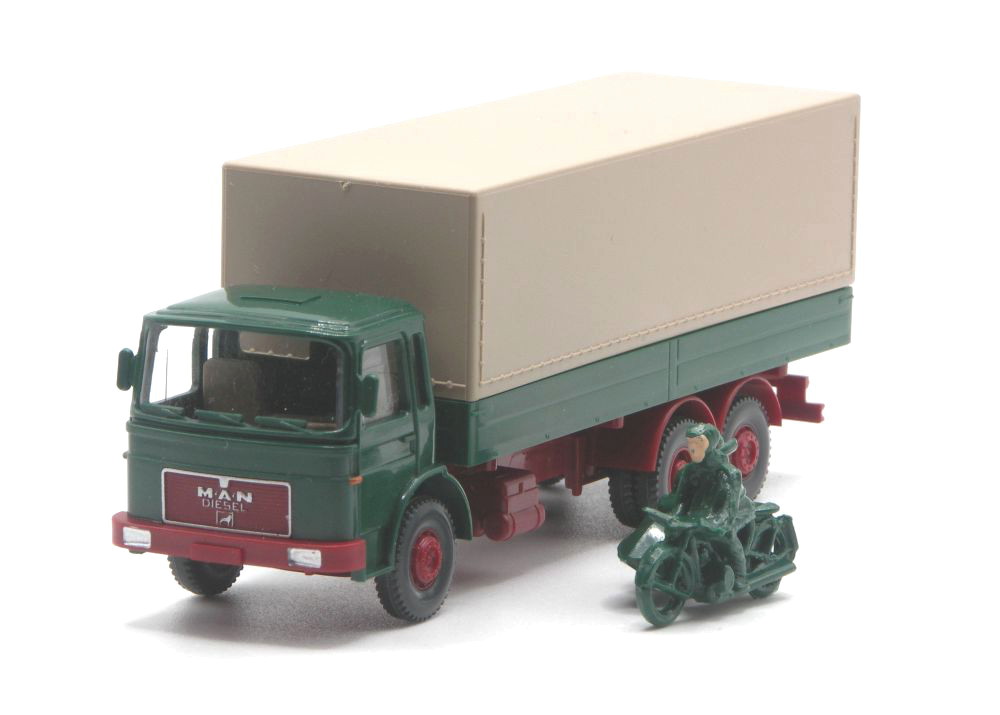 Schon mit dem gleich aufgebauten Serienmodell „Schenker“ (→ 0456.02) hat der Händler im März sein Sondermodell für den Herbst angekündigt. Der dreiachsige MAN LKW mit Pritsche und hoher Plane folgt dem bekannten Farbschema für die forstwirtschaftlichen Fahrzeuge von Michi Bloeßl. Die Aufbauten sind moosgrün. Fahrgestell, Felgen und der eingesetzte Grill sind purpurrot. Eine graubeige Plane ist auf die Pritsche aufgesetzt. Der MAN hat bemalte Scheinwerfer erhalten. Der Grill ist silbern gerahmt, MAN-, Diesel-Schiftzug und der Büssing-Löwe sind silbern bedruckt. Neben dem großen LKW geht der kleine Zubehörartikel fast unter. Im Druckklammerbeutel liegt jeder Klarsichtverpackung noch ein moosgrünes Motoradgespann bei. An dem sind wie einst die Gesichter handbemalt. Das exklusive Modell mit den beiden schweren Jungs ist auf 1.000 Stück limitiert, und kostet 27,37 Euro zzgl. Versandkosten.
