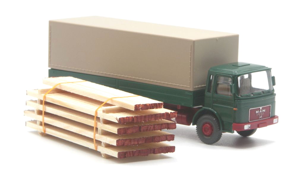 Als B-Version bietet der Händler einen Teil der Auflage auch mit einer separat verpackter Holzladung an. Diese wurde in kleiner Auflage von Ladegut Bauer passend für die Pritsche als Ladegut gefertigt. Diese passt freilich auch unter die Plane. Das Modell mit optionaler Holzladung kostet 35,70 Euro zzgl. Versandkosten.