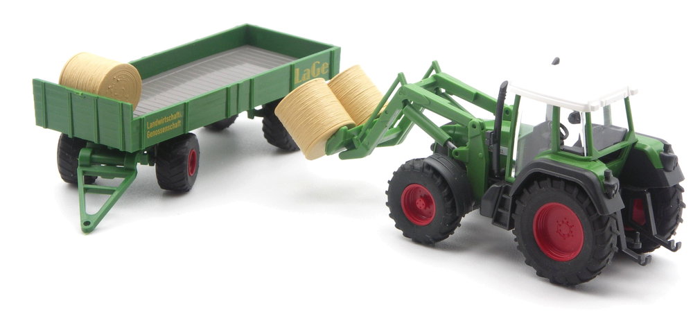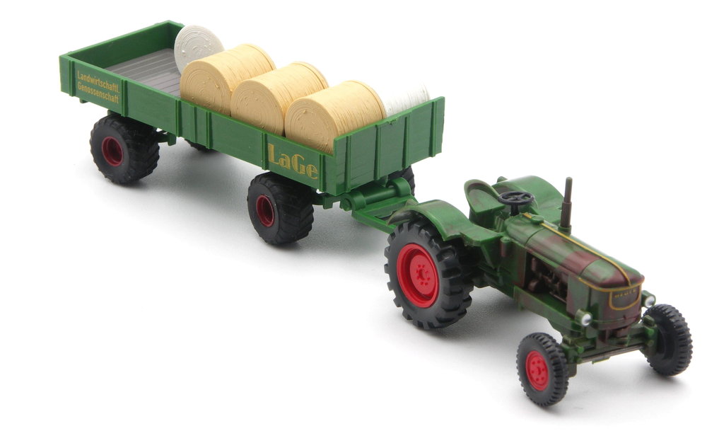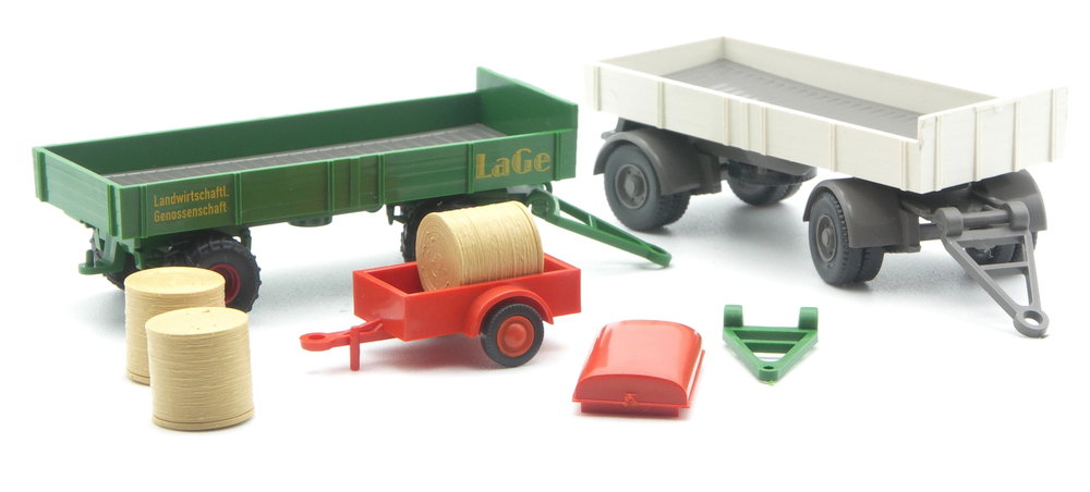 Der Anhänger hat farbgleich ein grasgrünes Fahrgestell. Zwei ebenfalls grasgrüne Deichseln mit unterschiedlicher Öse liegen bei, so dass auch ältere Schlepper mit dickem Zughaken als Zugfahrzeug gewählt werden können. Die Seiten tragen den gelben Aufdruck LaGe. Ortsneutral passt der Anhänger der Landwirtschaftlichen Genossenschaft, die sich Michi Bloeßl ausgedacht hat, in viele Modellszenen und Dioramen.