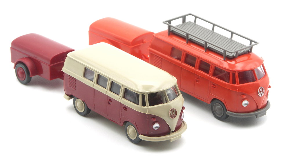 Für das Set kommt der PKW-Anhänger mit abnehmbaren Deckel komplett in rotorange zum Einsatz. Inkl der Buckelkappenfelgen. Der Bulli hat praktischer Weise schon eine Anhängerkupplung, so dass die Reise sofort losgehen kann. Damit ist der T1 Bus mit Gepäckträger nicht mehr alleine, wie sein Schwestermodell aus Set Landhandel 2 (Modell 20) nun mit Anhänger versehen.