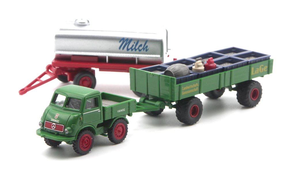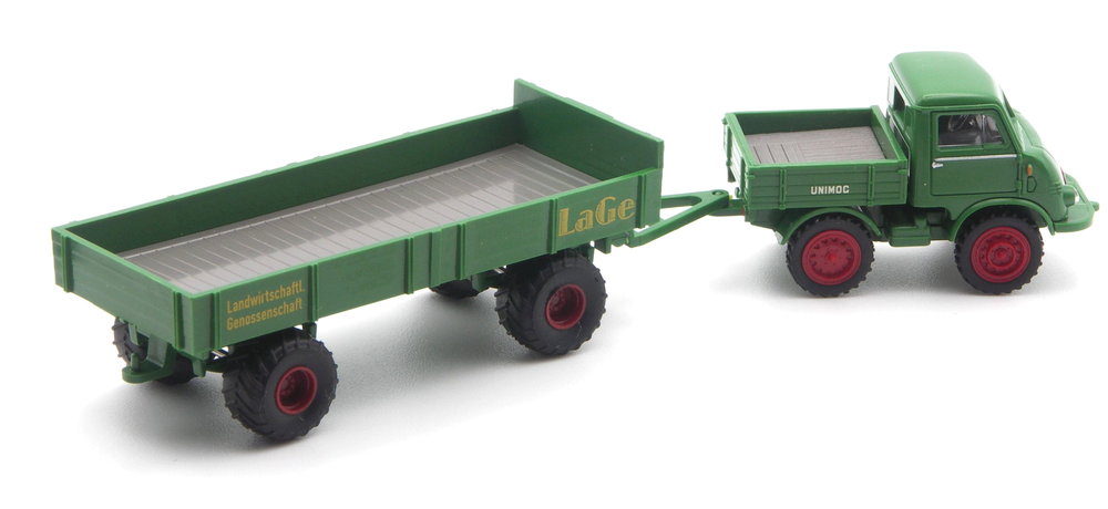 Als Alternative zum Milchtank-Anhänger kann der Unimog U 402 vom Gespann „Milchbubi 2“ (→ Modell 28) den farblich passenden landwirtschaftlichen Anhänger an den Haken nehmen. Denn die Milch muss nur einmal am Tag gefahren werden, da bleibt Zeit für weitere Transporte. Zum Beispiel für die fiktive LaGe – die Landwirtschalftliche Genossenschaft. Wein, Obst, Gemüse oder Milch in Kannen? Auf der grasgrünen Pritsche ist Platz dafür.