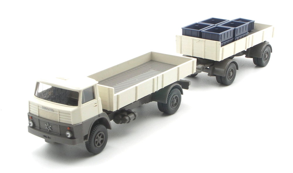 Zunächst auf dem Henschel HS 14/16 mit rekonstruierter Nahverkehrskabine in der Serie (0417.03), und jetzt auf dem Anhängerfahrgestell. Damit der Henschel HS 14/16 mit der Nahverkehrskabine nicht so alleine in der Virtrine stehen muss, bietet der Händler Der kleine WIKING-Laden mit seinem neusten Sondermodellset nun einen passenden Anhänger an.