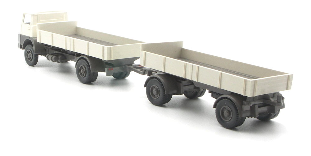 Die Pritsche ist perlweiß, das Chassis ist, inklusive der Deichsel mit größer Öse, wie beim Henschel quarzgrau ausgeführt. Ebenso die Felgen am Anhänger. Hier wurden 6-Loch-Felgen gewählt, nicht wie beim Zugfahrzeug Trilex. Auf eine Bemalung der Rückleuchten wurde verzichtet.