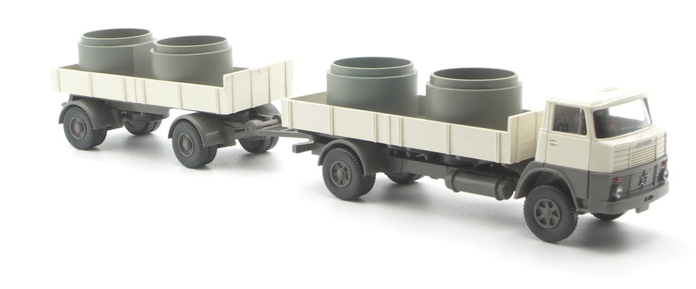 Mit doppelter Pritschenfläche ist genug Transportkapazität geschaffen, um auf den offenen Flächen Ladegut aller Art zu transportieren. Beispielhaft Betonröhren oder auch Transportkästen. Da eine passende Plane im Formenfundus bei WIKING fehlt, ist das neu gebildete Gespann ideal für kreative Ladegutbestückungen aller Art. Maschinenteile, Holz oder auch Ackergeräte können für Abwechslung in der Vitrine sorgen.