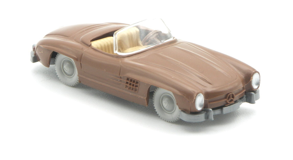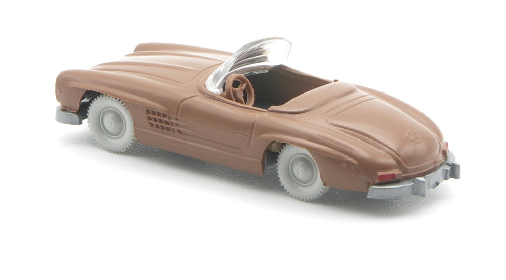 Für das Auktionshaus erscheint der 300 SL im Stil der Modelle der 1960er-Jahre. Mit grauen Rädern und reduzierter Bemalung. Nur die Scheinwerfer und Rückleuchten sind bemalt. Beim Serienmodell war z.B. auch das Verdeck bedruckt, der Grill schwarz abgesetzt und die Zierleisten silbern bedruckt.