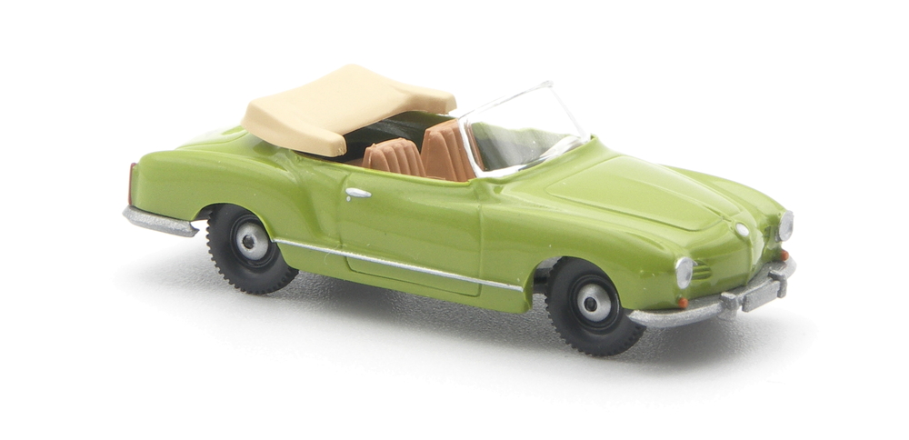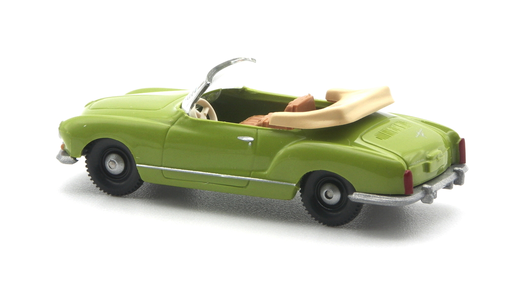Was da alles entsteht, zeigt der Bericht zur Spielwarenmesse. Als Erster im Bunde fährt nun der Karmann Ghia vor, so wie er in Nürnberg vor ein paar Wochen bereits gezeigt wurde. Die grüne Karosserie ist grün lackiert und bekommt ein Klarlack-Finishing. Die Einrichtung mit perlweißem Lenkrad ist braunbeige, die spendiert der MB 190 SL (0250). Das beige Verdeck wurde einst für das Porsche 911 Cabrio entwickelt.