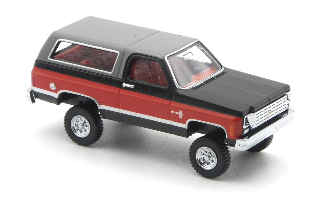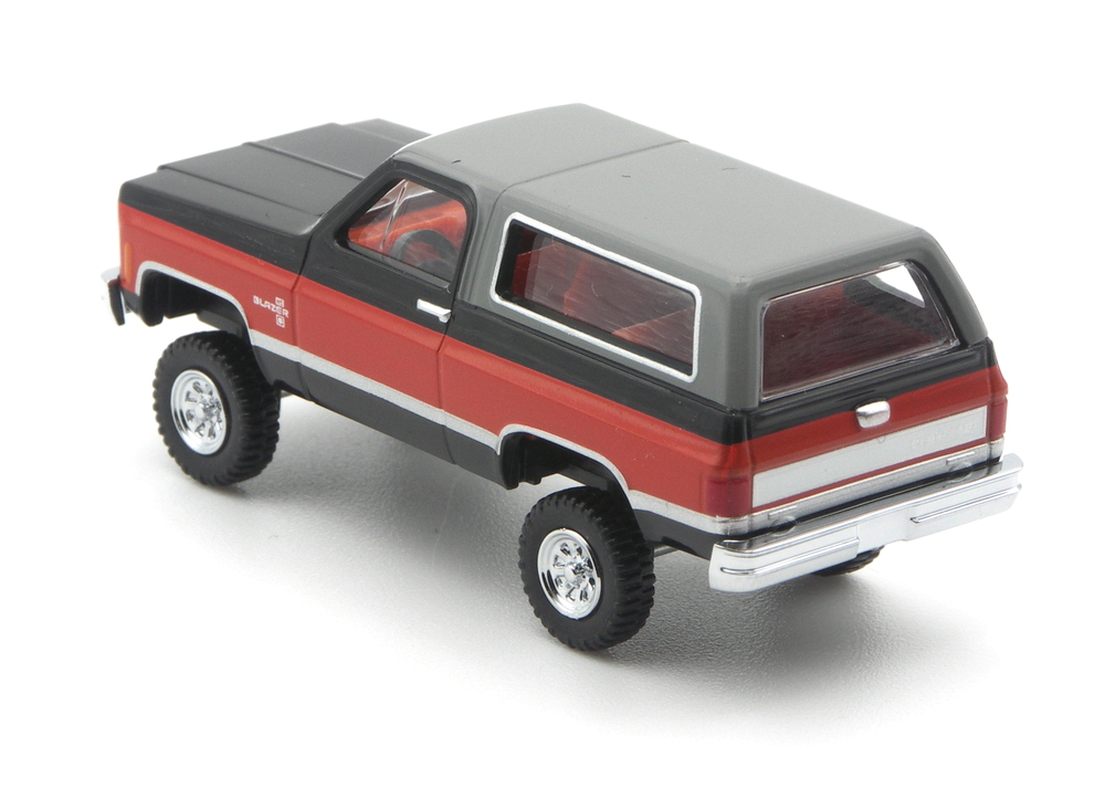 Optisch sehr passend ist die rote Inneneinrichtung mit schwarzem Lenkrad. Das Dach ist grau abgesetzt, das Hardtop ist deckend bedruckt worden. Auch hier darf Chrom nicht fehlen. Kühlergrill, Felgen und Stoßstangen sind verchromt. Die Blinker sind orange, die Rückleuchten sind rot bedruckt. Silberne Zierlinien, Türgriffe und Fensterrahmen gehören auch hier zum Bedruckungsumfang. In der Farbkombination könnte der Blazer glatt als Zweitwagen des A-Teams durchgehen.