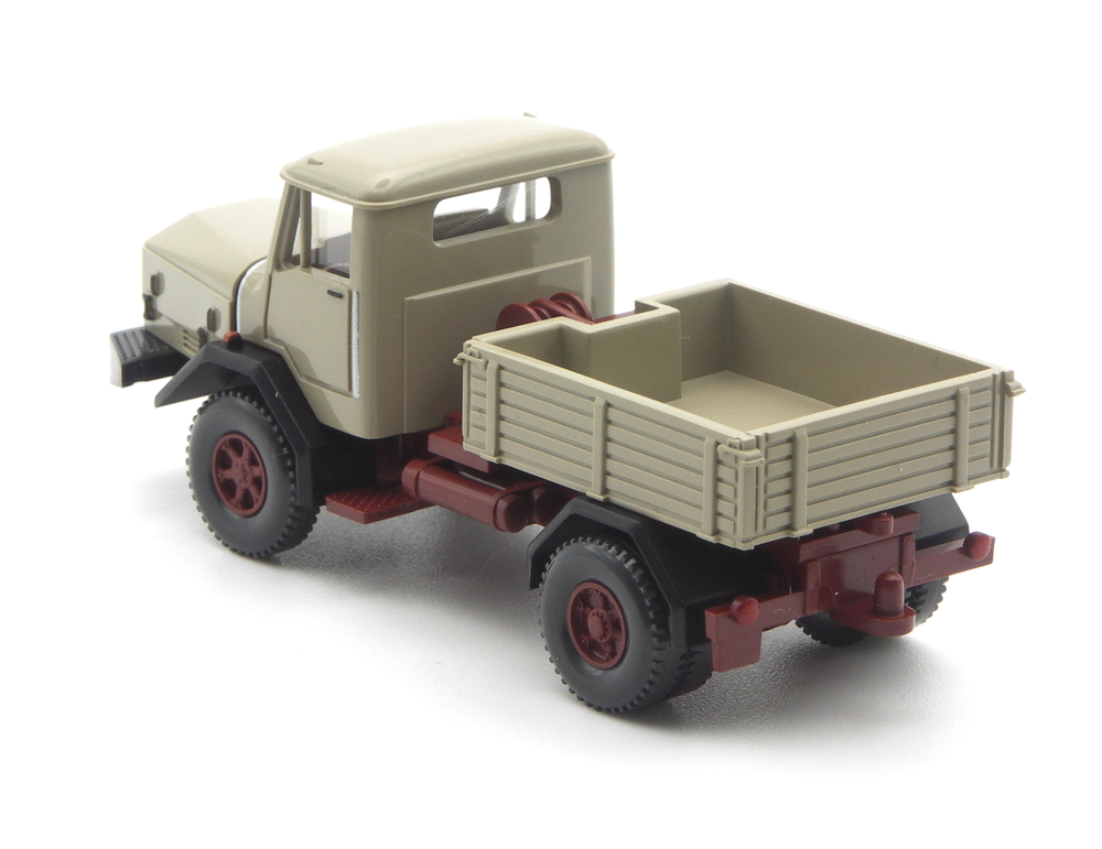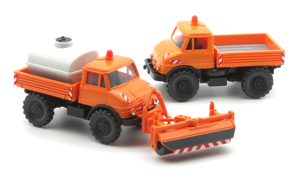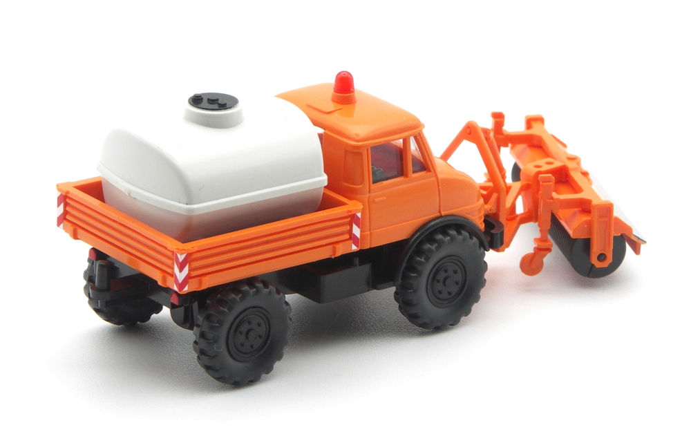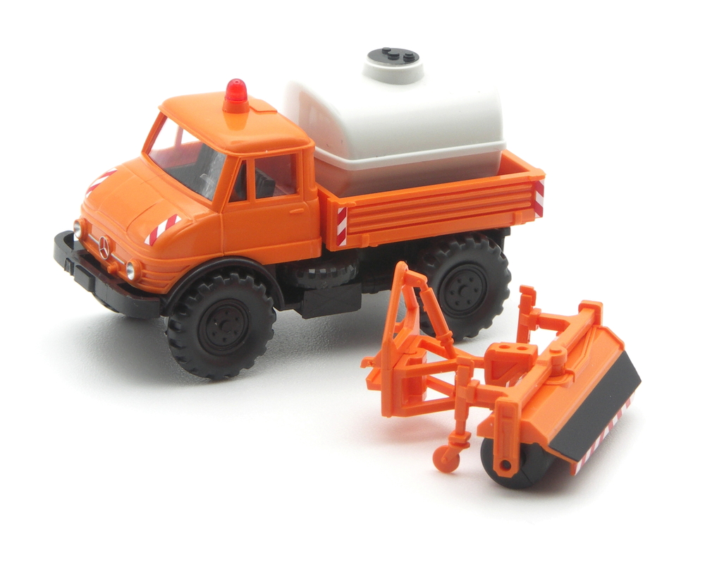 Anders sind die Felgeneinsätze, jetzt 6-Loch. Die Einrichtung ist schwarz statt rehbraun. Und es fehlt eine rot-weiße Warnschraffur am vorderen Kotflügel. Ansonsten können die beiden Fuhrparkbrüder sein. Der neue Unimog trägt den Kehrbürstenvorsatz das erste Mal, eine passende Kombination aus Altmodell und deutlich jüngeren und filigraneren Bauteilen. Die Kehrbürste liegt zur Eigenmontage der Packung bei. Der Bürstenkasten bekommt wie die Pritschenkanten und die Motorhaube eine rot-weiße Warnschraffur.
