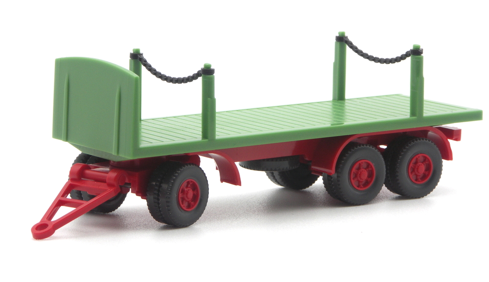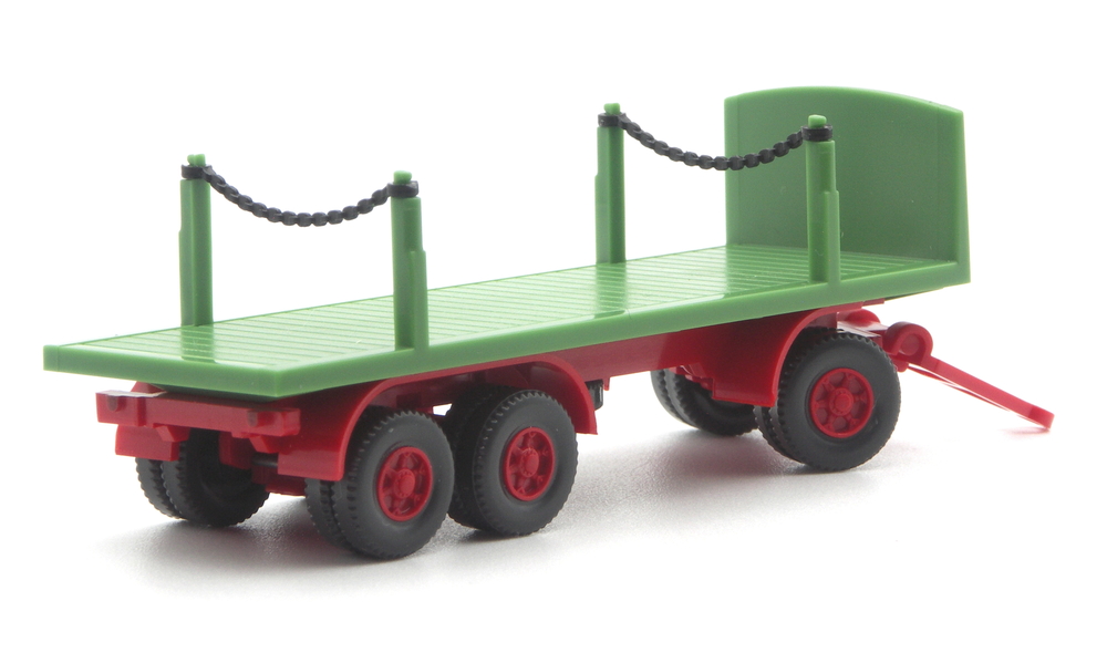 Wie erwartet folgt zeitnah auf die Flachpritsche nun die Variante mit Rungen. Auch in der Kombination rot und grün, jedoch in anderen farblichen Abstufungen. Das Fahrgestell ist nun karminrot ausgeführt, der Aufbau hellmaigrün. Damit ist der Anhänger – wie einst die solo angebotenen Anhänger – ein farblicher Einzelgänger. Der Anhänger passt durch den helleren Grünton leider nicht zu den Fahrzeugen der Spedition Kliem, die über den Händler ModellCarService vertrieben wurden, oder zum zweiten Milchbubi-Unimog.
