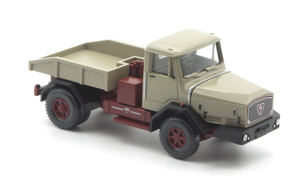 So weiß die Faun Zugmaschine mit der mächtigen Haube in der Farbgebung zu gefallen. Das oxidote Fahrgestell, Grill und die gleichfarbigen Anbauteile wie die Seilwinde wirken sehr harmonisch zum Aufbau. Kotflügel und Peilstangen sind schwarz ausgeführt, die Schnallen an der Motorhaube und die Türgriffe sind schwarz bedruckt. Wie üblich sind Scheinwerfer, Blinker und Rückleuchten bemalt bzw. bedruckt. Auf dem Tank finden sich dazu Logo und „Faun Werke – Nürnberg“- Schriftzug in weißer Druckfarbe.
