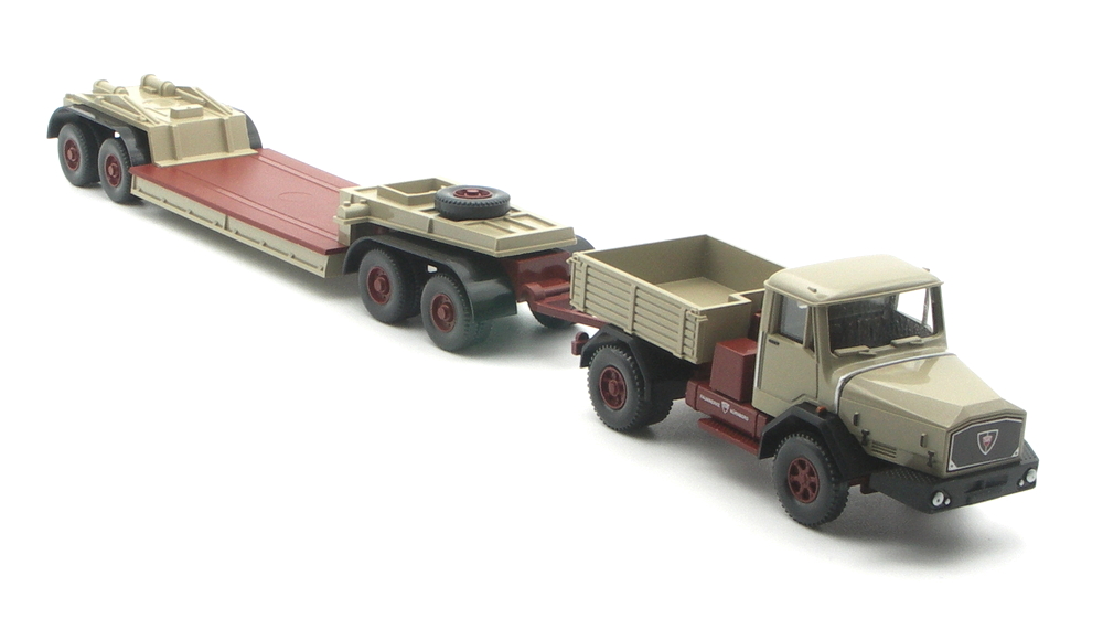 So lässt sich der olivgraue Zugmaschine mit dem 4-achsigen Tiefladeanhänger (0504.54) kombinieren. Oder auch dem kleinen 2-achsigen Tieflader (0492.50 oder 0492.51) aus den einst beim Spielwarenhandel Wasmus verkauften Modellgespannen. Dabei kann der neue Eigner entscheiden, ob er die Stahl- oder die Holzpritsche aufsatteln will. Die zweite Pritsche liegt als Zubehör der Verpackung bei.