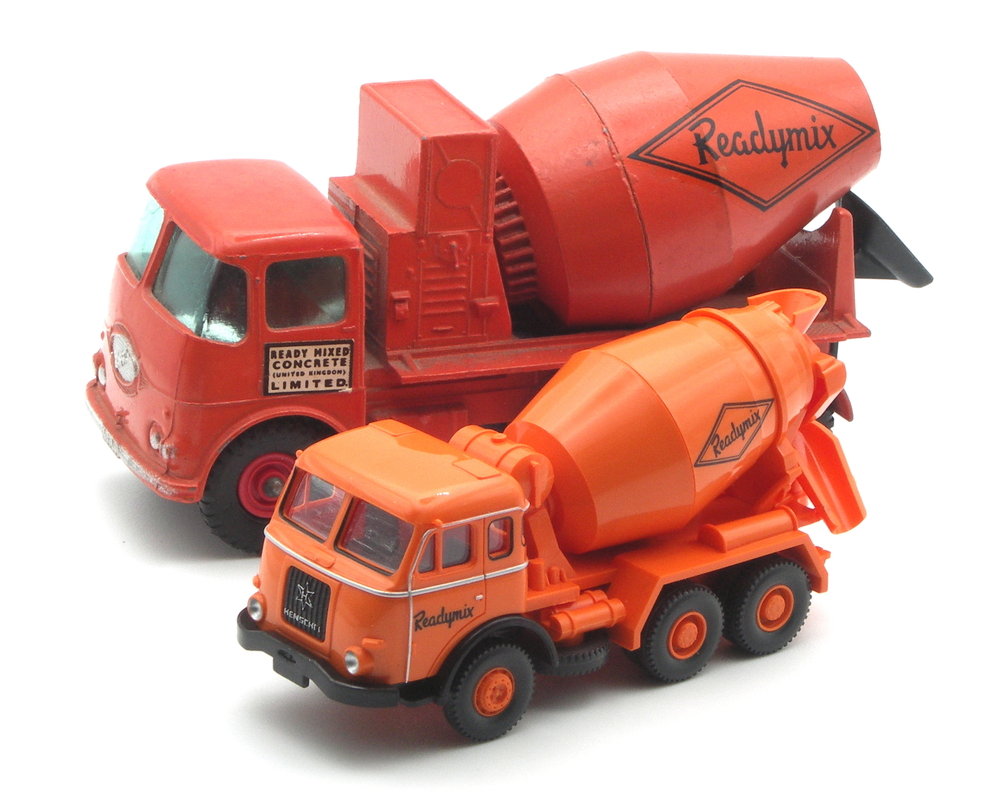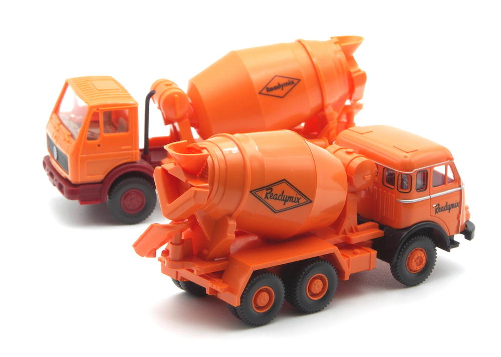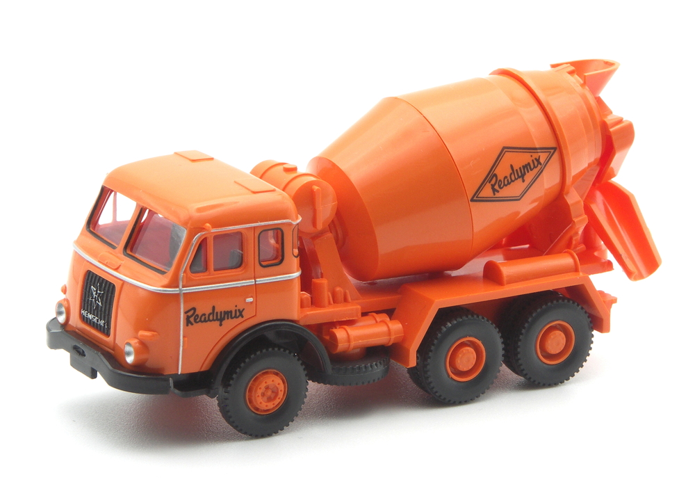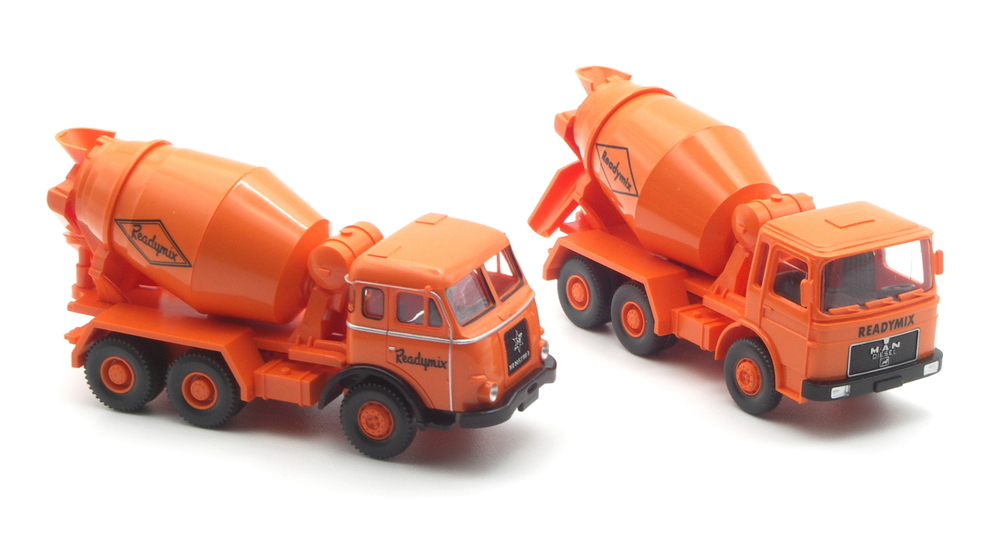 Erstmals 1977 gab es mit dem MB 2224 (NG) bei WIKING einen Betonmischer mit Readymix – Bedruckung. Zunächst noch mit Schreibschrift, dann später mit den neuen Schriftzug in Druckschrift. 2014 folgte ein Chemikalien-Sattelzug mit MAN Pausbacke aus den 1960er-Jahren, 2015 ein Betonmischer mit Magirus Fahrerhaus als Vertreter der späten 1960er- und frühen 1970er-Jahre. Aus gleicher Vorbildepoche bildete der MAN F7 dann 2018 den bisherigen Schlusspunkt im hellrotorangen → Modellfuhrpark.
