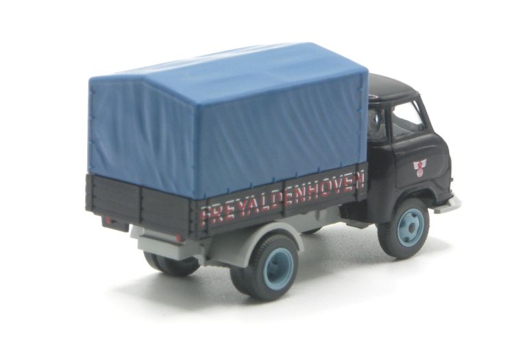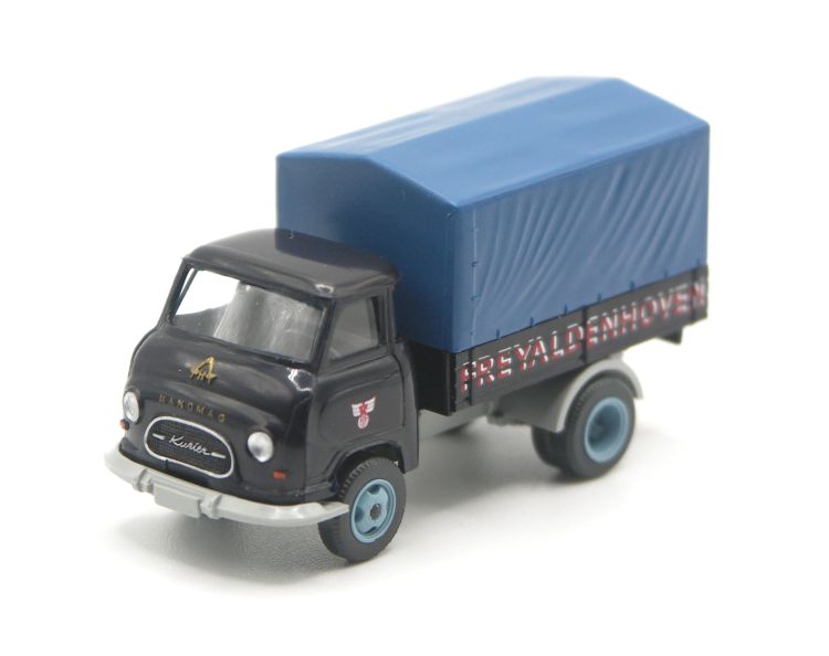 Wie beim Borgward wird auch die Kabine des Hanomag inzwischen mit einer Inneneinrichtung versehen, die an dem Modell basaltgrau ist. Fahrgestell und Pritsche aus alten Formen werden mit neuen Bauteilen ergänzt. Zusammen mit den vorbildgetreuen, zweiteiligen Räder mit azurblauen Felgen und der azurblauen Plane aus der neuen Form wird der Klassiker zeitgemäß aufgewertet. So kann der Hanomag Kurier die → Fahrzeugflotte der Spedition Freyaldenhoven im Haus-zu-Haus-Geschäft unterstützen. Das geht natürlich auch ohne Plane, mit anderer Ladung aus der Zubehörkiste, um diverse Lieferszenen nachstellen zu können.