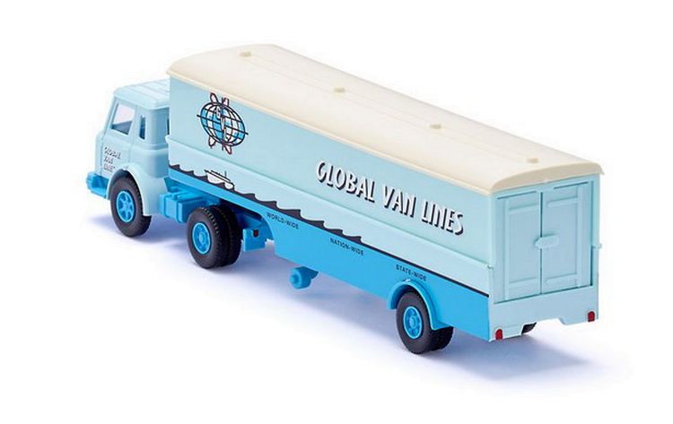 Die weißblaue US-Zugmaschine mit hellblauem Fahrgestell sattelt den kleinen Ackermann Möbelauflieger auf, der in den selben Farben zweifarbig ausgeführt ist. Der Sattelzug bildet einen Möbeltransportwagen der Spedition Global Van Lines nach, die sich auf nationale und internationale Umzüge spezialisiert hat. Der großvolumige Auflieger bietet genug Platz für Hausstand oder Büroeinrichtungen. Anders als beim Chevrolet Möbelwagen (0540.xx) liegen aber keine Landhausmöbel bei.
