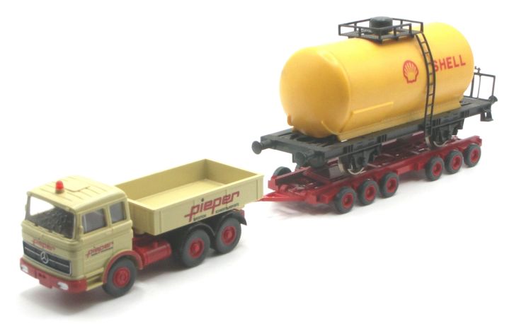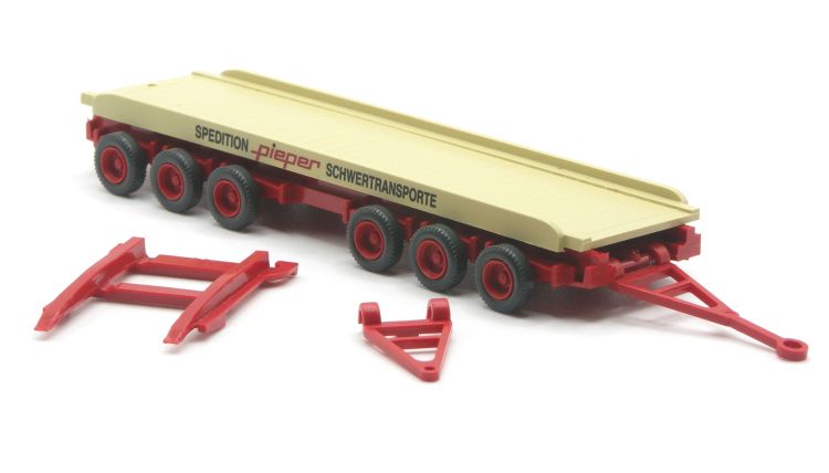 Die grünbeige Pritsche hat an den Flanken den zweifarbigen Firmenschriftzug „Spedition Pieper Schwertransporte“ erhalten. Damit ist die CI gewahrt. Da unterschiedliche Zugfahrzeuge möglich sind, wurden zwei unterschiedliche Deichseln beigelegt. Eine lange mit großer Öse, und eine kurze mit großer Öse. Für den Transport von Eisenbahnwagen sind die Auffahrrampe und die Bremsplatte beigefügt.