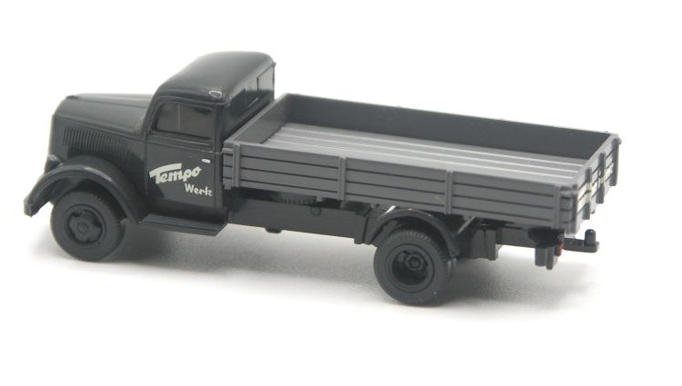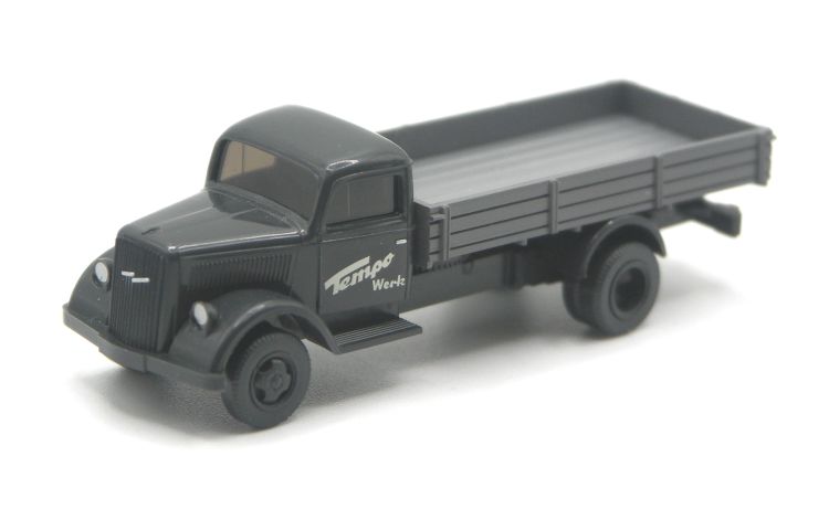 Beim Vorbild dürfte es sich um ein Vorkriegsmodell, oder um einen in der Kriegszeit gebauten Opel gehandelt haben, der nun in der Transporter-Produktion von Tempo zum Einsatz kam. Da die Transportwege sicherlich kurz, und die Beladung von allen Seiten erfolgen musste, ist folgerichtig auf eine Plane verzichtet worden. Die Pritsche stammt vom Opel Blitz Nachfolger, so dass auch dessen Planen aufgesteckt werden können, wenn als Variante in der Vitrine gewünscht.