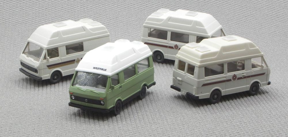 Zehn Jahre war der VW LT als Wohnmobil „Sven Hedin“ nahezu unverändert im Programm. Fast nur die Farbe des Chassis sowie die Farbe und Anzahl der seitlichen braunen Streifen änderte sich. 1990 endete die grauweiße Ära des Wohnmobils. Auch so ein Mauerblümchen. Glatte Scheibenräder, ohne Bemalung, ohne aufgedruckten Herstellernamen oder Typenbezeichnung, ohne viel Esprit. Dabei ist es so ein schönes Modell, sogar mit vorbildgetreuer Einrichtung.