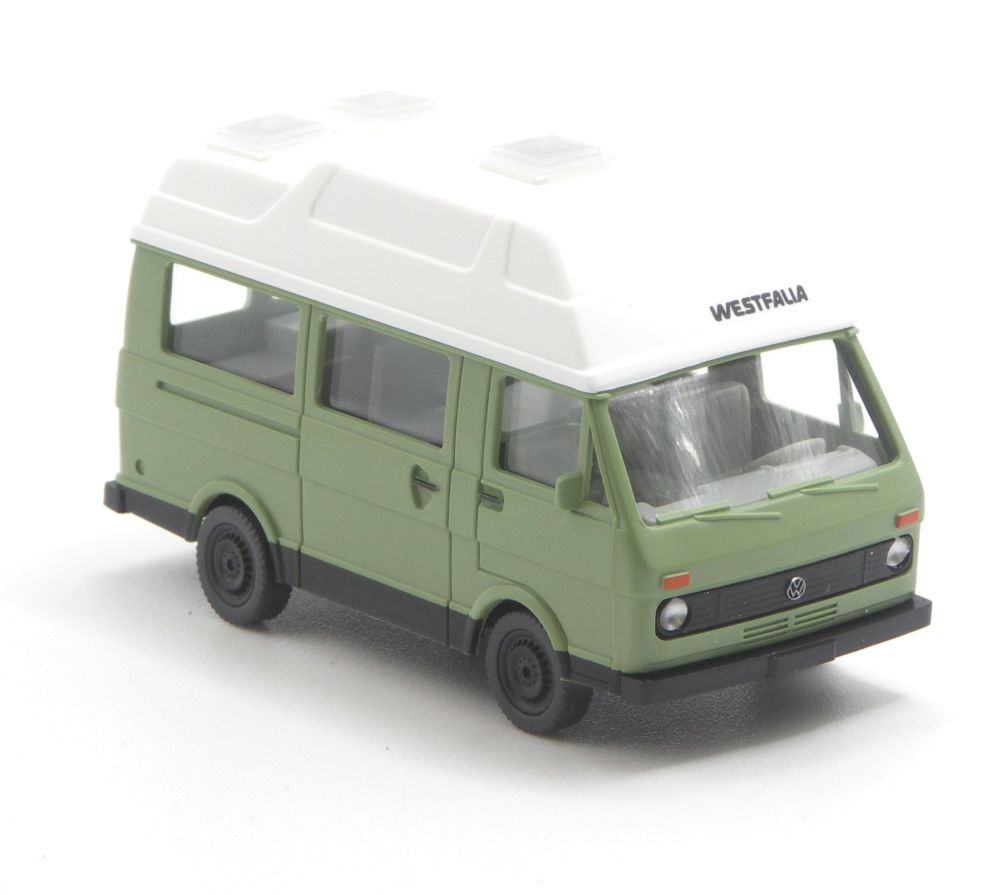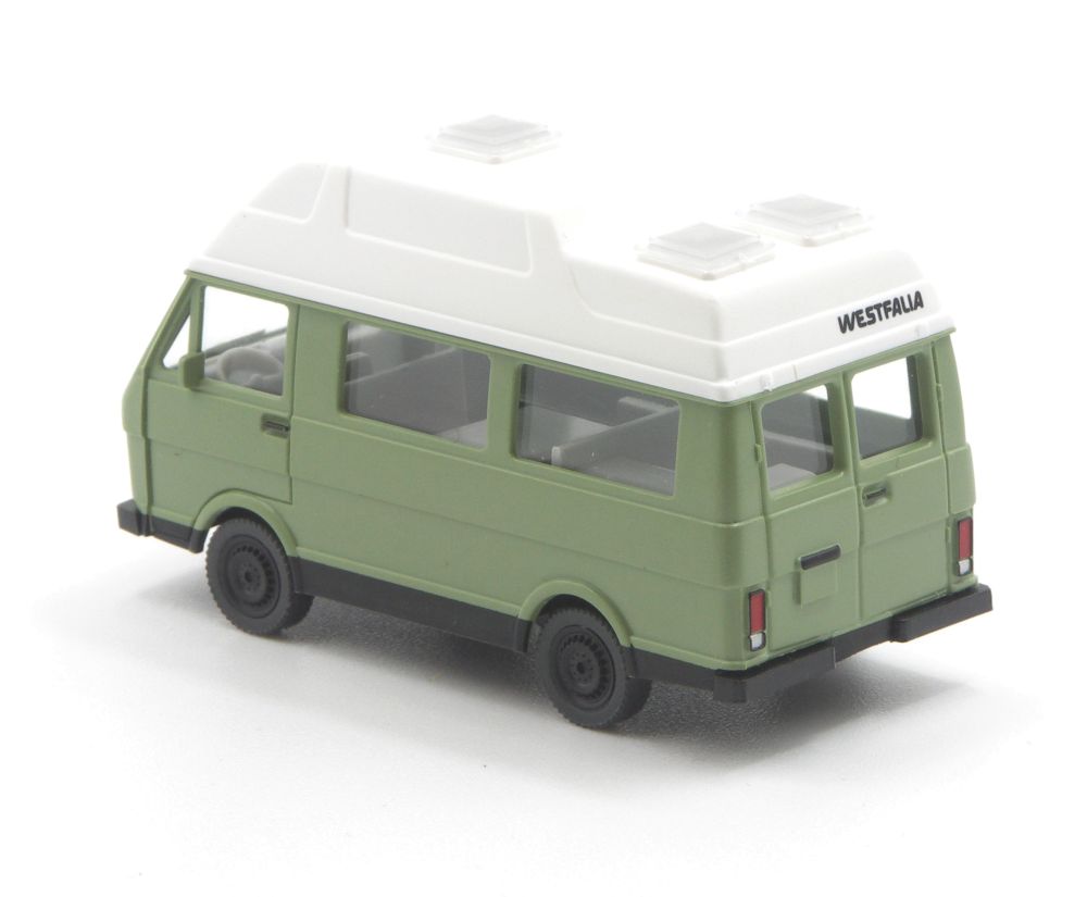 Farbe kommt erst jetzt nach 35 Jahren ins Spiel. Die Neuauflage des Freizeitfahrzeugs mit Hochdach ist hellgrün. Und verrät erstmals seine Herkunft. In schwarzer Schrift ist am weißen Dachaufbau der Westfalia-Schriftzug zu lesen. Innen gibt es eine lichtgraue Einrichtung. Da ist also fast alles beim Alten. Für einen zeitgemäßen Modellauftritt dürfen die bemalten Leuchten vorne und hinten, ein gesilbertes VW-Logo vorne und vorbildgetreuere Felgen in schwarzer Farbgebung nicht fehlen.