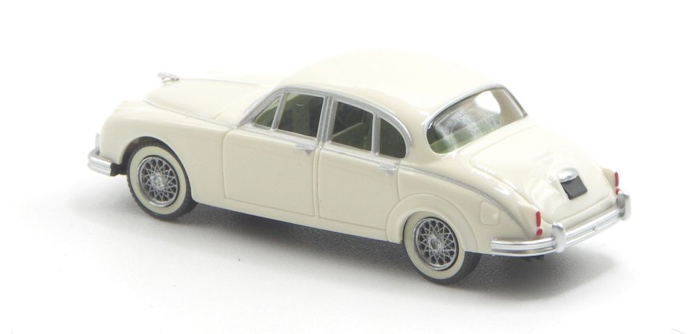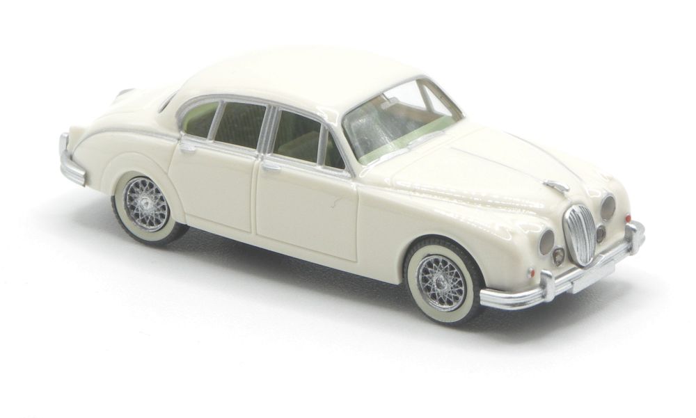 Was kann man verändern, wenn alles andere schon gut und da ist? Die Farbe. Daher ändert sich beim klassischen Jaguar MK II bei dieser Wiederauflage auch nur die Karosseriefarbe. Alles andere bleibt, wie es war. Der 1999 ins das Lieferprgramm aufgenommene Engländer darf sich ab sofort im edlen Perlweiß um die Gunst der Sammler bewerben. In den vergangenen zwei Jahrzehnten wurde der Bemalungs- und Bedruckungsumfang nur noch minimal um die Akzentuierung der Rückleuchten, Blinker und Zierleisten ergänzt.