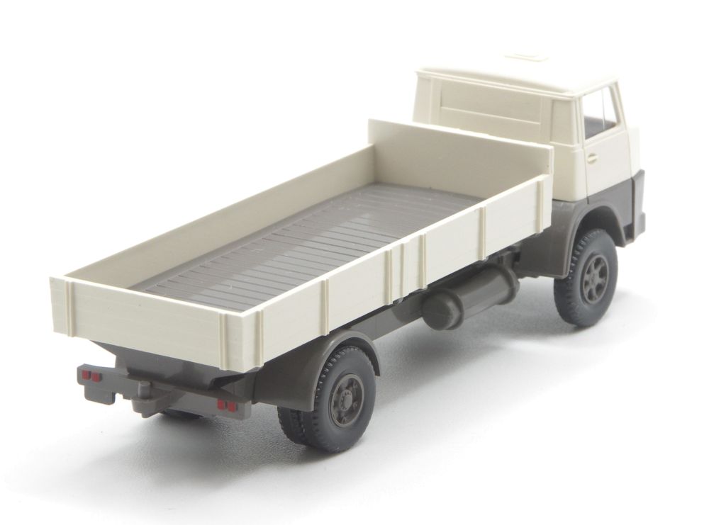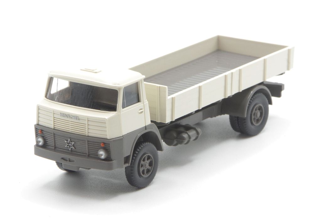 Die Altform wurde im Lager ausfindig gemacht, und überarbeitet. Leider gibt es keine passende Plane für die Pritsche aus der alten Form, so dass der Henschel bei folgender Verwendung dieser Pritsche das Stückgut immer ohne Wetterschutz transportieren müsste. Für die erste Neuauflage aber eine gute Wahl, denn so entsteht ein Modell mit einem Hauch des Flairs der Altmodelle bis Anfang der 1970er-Jahre. Die perlweißen Bauteile wurden mit dem zweiachsigen Fahrgestell kombiniert, welches auch früher schon für den Henschel HS verwendet wurde. Später fand es z. B. beim MB 1617 (0420) Verwendung.