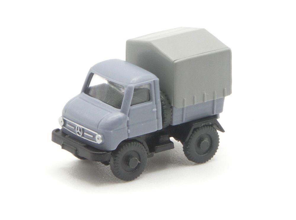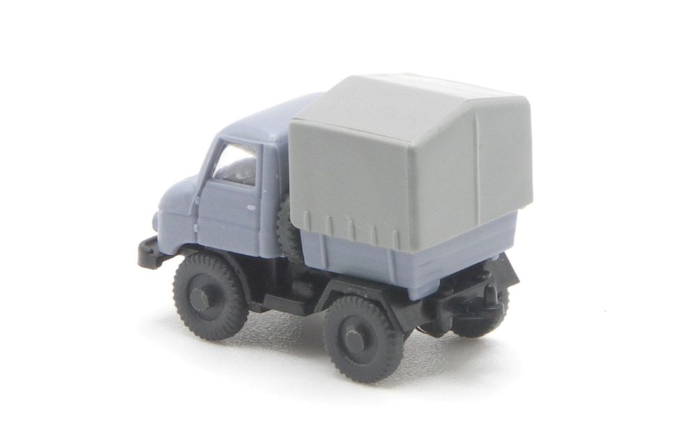 Der Unimog rollt auf einteiligen Rädern mit unbemalter Kappe. Erstmals bei einer zivilen Variante wurde eine graue Plane auf die Pritsche gesetzt. Der Grillbereich ist silbern gerahmt, der Stern und die Scheinwerfer sind silbern.