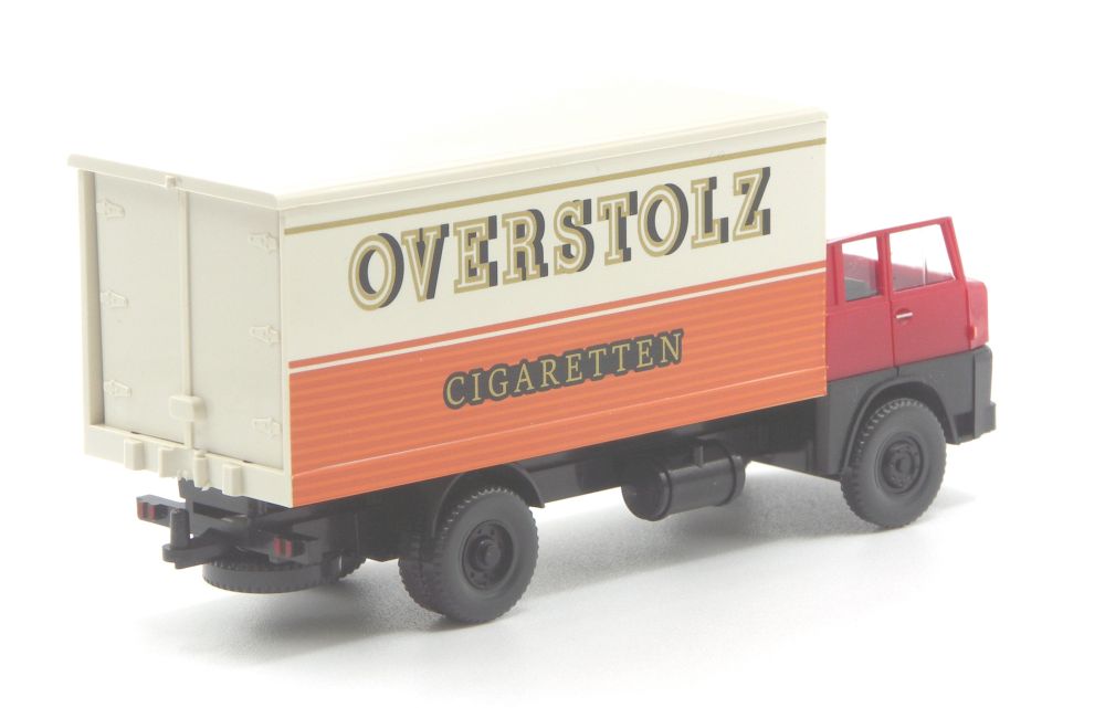 Die Kombination wirkt also auf den ersten Blick ungewöhnlich, hat aber ein reales Vorbild. Ein → Foto zeigt einen fabrikneuen Henschel HS 16 TL mit Kofferaufbau. Die Kabine trägt bereits die Overstolz-Werbung. In Anlehnung an dieses Vorbild hat WIKING den Klassiker miniaturisiert. Ein zeitgenössischer Kofferaufbau mit abgerundeten Kofferkanten fehlt (noch, hoffentlich) im Formenfundus. Eine kleine Unschäfte bei den Modellen. Der 70er-Jahre Koffer stammt, wie schon beim Henschel HS 165 Union-Transport Modell (→ 0425.02), vom Magirus 100 D7 LKW mit Tandem-Anhänger (0426). Erkennbar an der Kerbe für die Anhängerkupplung des Anhängers am Kofferboden. Er ist auf einem schwarzen Hilfrahmen auf dem ebenfalls schwarzen Chassis (vom Krupp 806) aufgesetzt.