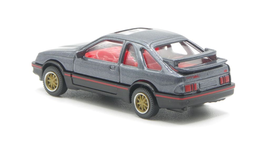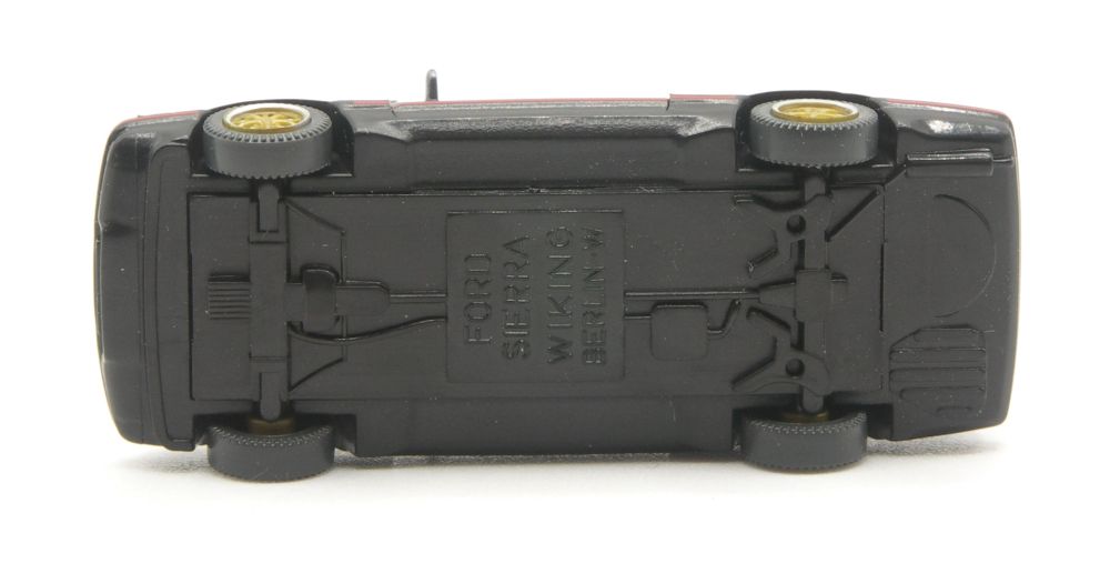 Silberne Scheinwerfer, rote Rückleuchten, Schriftzüge und rote Zierlinien sind am Modell zu finden. Ford-Logo vorne und die Schriftzüge hinten sind rot aufgedruckt. Das Vorbild hat ein zeitgenössisches Tuning erhalten, inklusive verkehrsroter Inneneinrichtung. Schickes Detail, die Alufelgen sind golden, haben eine silbernen Rand aufgedruckt bekommen. So schön war der Ford Sierra bei WIKING noch nie – und ist nach 40 Jahren endlich kein farbloses Mauerblümchen mehr.