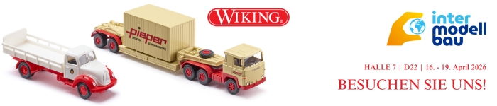 Auch 2026 lädt die INTERMODELLBAU vom 16. bis 19. April wieder nach Dortmund ein – und WIKING ist mit einem abwechslungsreichen Programm in Halle 7, Stand D22 vertreten. Am WIKING‑Stand erwartet die Besucher ein erster Ausblick auf spannende Neuheiten des Jahres. In den Vitrinen sind zudem aktuelle Modelle aus dem laufenden Sortiment zu sehen. Für Sammler und Fans gibt es exklusive Messemodelle – den Getränke‑Lkw (Magirus Sirius) „Dortmunder Union“ sowie den Tiefladesattelzug (Scania 111) „Pieper“.